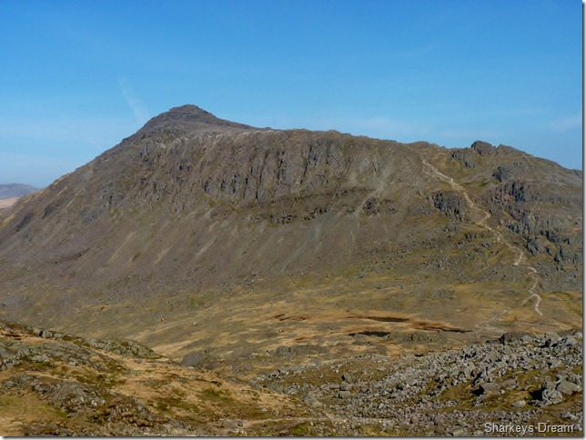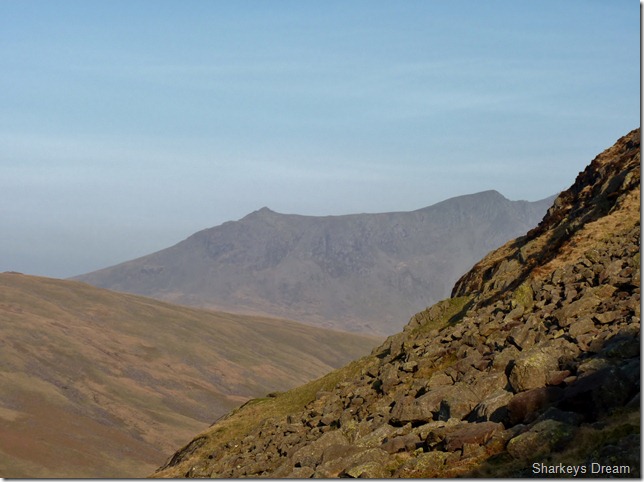 Slight Side, Sca Fell, Mickledore & Scafell Pike through the haze. |