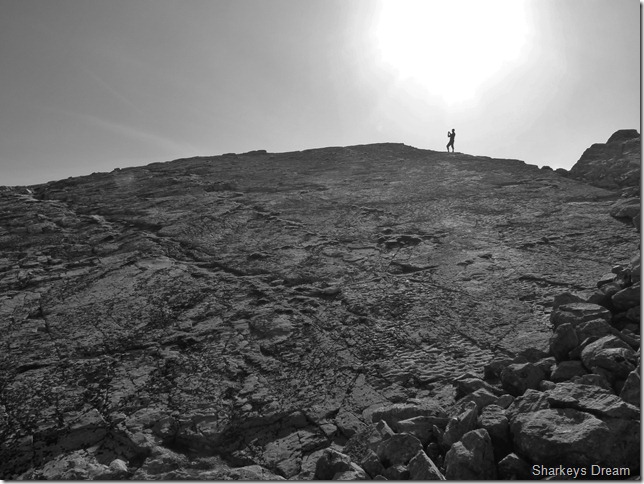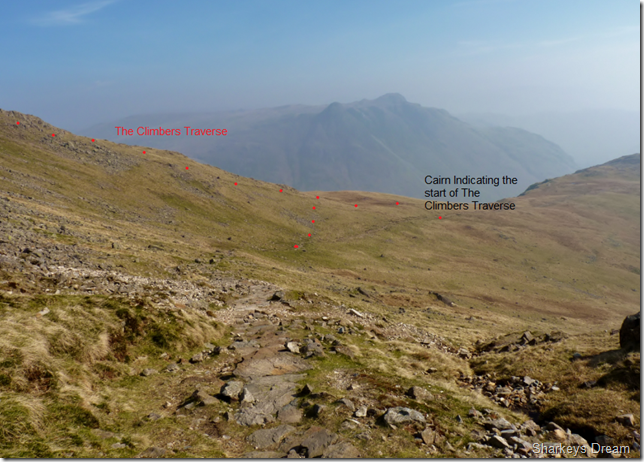 It was here I was to leave the path you see at Three Tarns just over to the right, I felt in great fettle as I was managing the heat really well. The haze however continued to lack morale & I guess that this factor contributed to me taking on The Climbers Traverse.