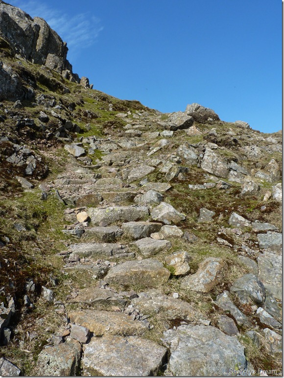 Almost at the top of path where The Climbers Traverse takes in a horizontal aspect all the way to Bow Fell Buttress & the Great Slab, its a little while off yet & before I get there at the top of these steep steps do I take off the pack for a fuel stop. |