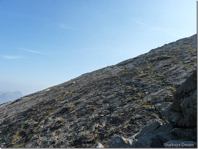 Little of my musings are depicted in this photo crossing the summit path where sadly out of shot more spurs of solid flat rock continue. |