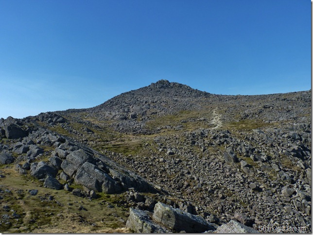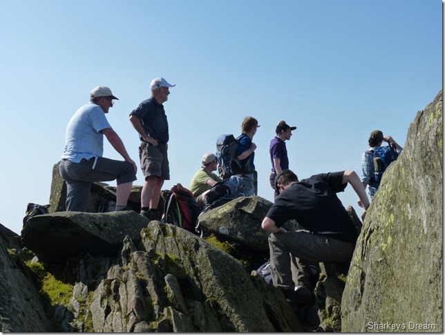I gain the last reaches of the summit over boulder-fields to be met by quite a gathering at the summit, I spot a little rock with my name on it, but I have to pass through the large group in order to gain my resting place ‘I’m not going to say it I mutter, but its too damn hot to be walking in this weather’ I’m greeted by a few chuckles & yer not wrong there lad.