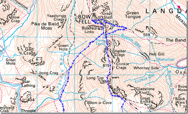 The best way off the traverse to the summit lies up the fringe of a ‘river’ of boulders along the south side of Cambridge Crag or more tediously, the wide scree gully between Cambridge Crag and Bowfell Buttress may be ascended. (Cambridge Crag is identified, beyond all doubt by the waterspout gushing from the base of the cliff – and nothing better ever came out of a barrel or a bottle)