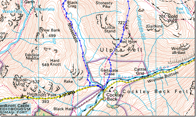 Cockley Beck – Ulpha Fell – Little Stand – The Bad Step – Crinkle Crags – Three Tarns – Climbers Traverse – Bow Fell – Three Tarns – Lingcove Beck – Moasdale – Moasdale Beck – Cockley Bridge |