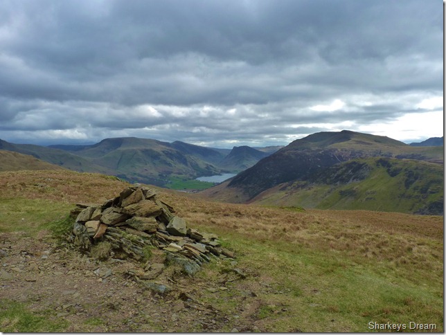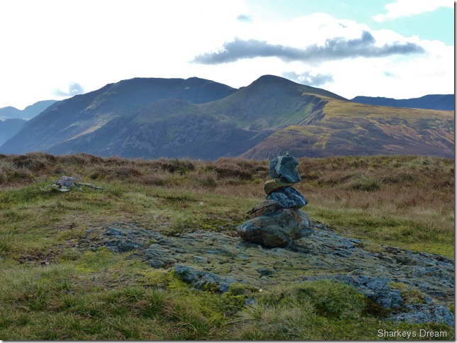 The south & main summit of Mellbreak depicted here by this ever so carefully stacked cairn, In the distance we have Red Pike & High Stile. |
