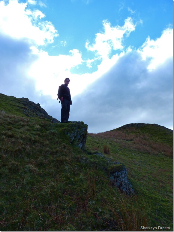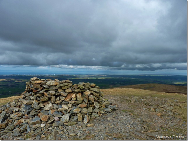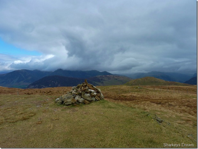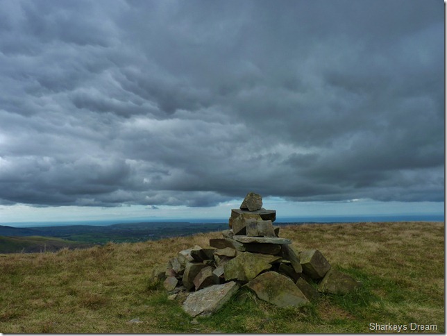 Dark protruding skies greet us at the summit of Burnbank Fell. |