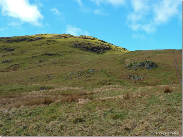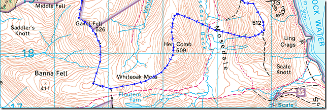 Our ascent on Hen Comb lays in direct (there’s that word again) with the Holly Tree, once Mosedale Beck has been crossed at the flanks of the fell, then did we make with our ascent via a wire fence shown vaguely at the lower fell side just to the right of the grey patch of scree. |