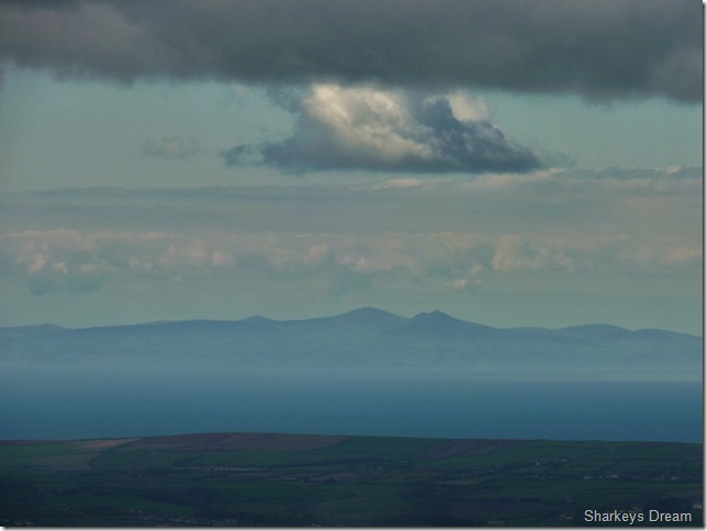 Zooming in over open sea at the Snaefell Mountain range on the Isle of Man. |