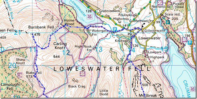 Loweswater – Kirkgate Farm – Melbreak – Mosedale – Hen Comb – Whiteoak Moss – Gavel Fell – Fothergill Head – Blake Fell – Burnbank Fell – Holme Beck – Holme Wood – Watergate Farm – Maggie’s Bridge – Loweswater – Kirkstile Inn |