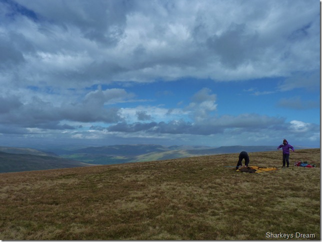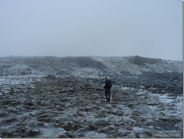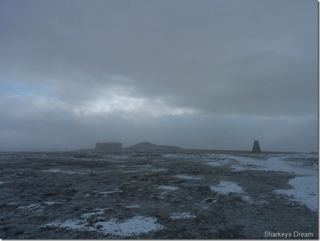Stuart takes a photo of the Trig point & then makes for the shelter, I am a little disappointed with the conditions on top as I wanted to do a tad exploring of the remains, of what was said to be a settlement or a fort, situated here at the summit, to this day the remains haven’t been fully confirmed whether they are Roman or Celtic, a fort or a settlement,