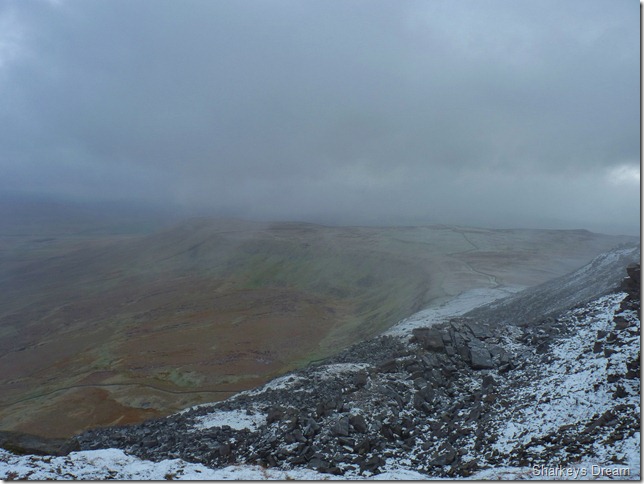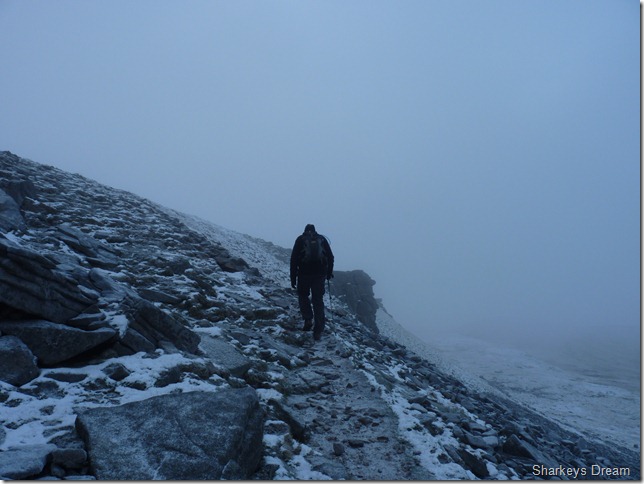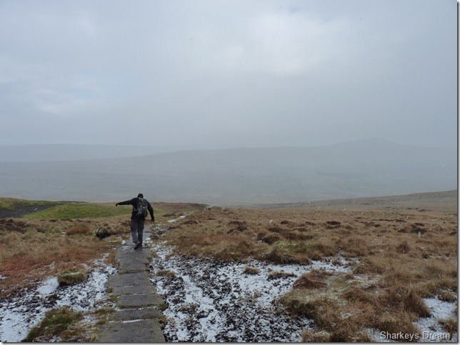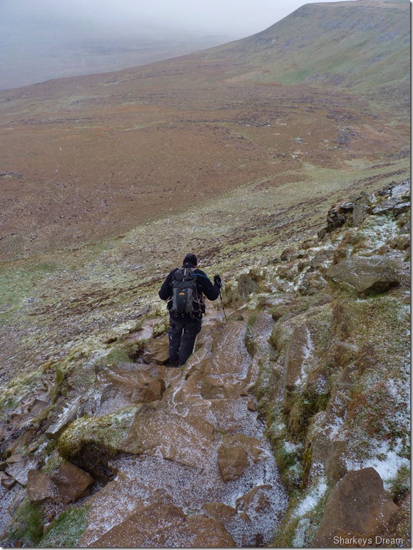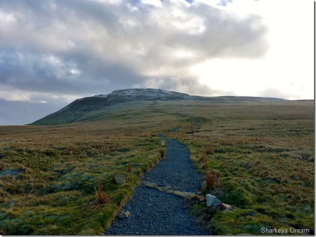 The path here is near perfect yet steep with exception to a bit of mud, here we are met by half a dozen folk coming down the mountain, be it running or walking, some stopped to chat & just say hello, the topic of conversation was just how windy it was ‘up there’ coming from Ingleborough in the snowy conditions such as we had, we figured this could be handled adequately.