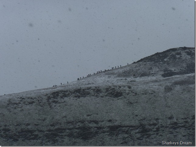 It was still snowing when I took this photo of a group of walkers leaving the summit (possibly three peakers) |