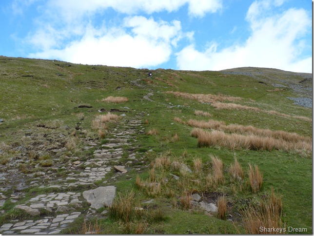 Through millennia the path is easy to stick to & locate, Simon Fell lays at the far end of the ridge yet our way down was via a very steep path somewhere in conjunction with the stone wall you see in the left hand bottom of the picture. |