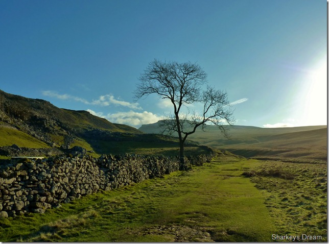On reaching Fell Lane as we climbed our way out of the village I am struck with my first sight of Ingleborough, it really is a crisp beautiful morning, perfect walking conditions even, but in all this grandeur I have forgotten my sunglasses, they sit in the door pocket of my car back in Wigan, when right now they should be sitting on the bridge of my nose, I struggle with the sun’s glare only looking up when I really have to, even this causes my eyes to water un-controllably for the next few miles. |