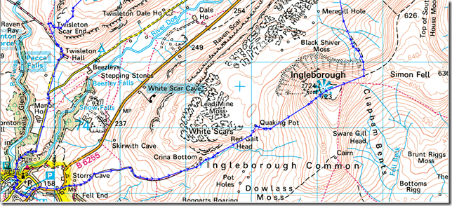 Ingleton – Fell Lane – Crina Bottom – Ingleborough – Humphrey Bottom – Chapel-le-Dale – Bruntscar – High Pike – Whernside – Combe Scar – Scales Moor – Twisleton Scar – Roman Road – Oddies Lane – Ingleton |
