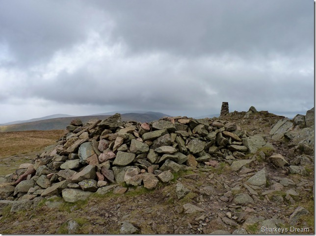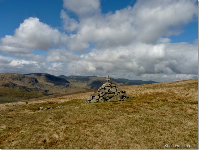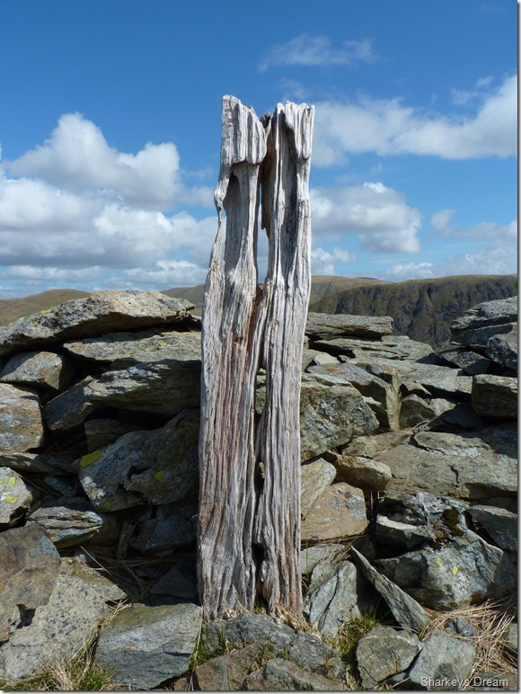 A cairn sits near by but this old wooded post marks the true summit of Hartsop Dodd.