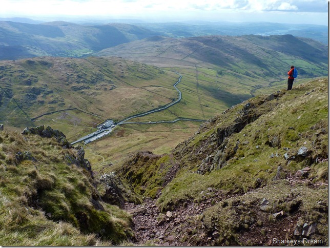 The descent down Hartsop Dodd can be tricky at times, its path is narrow & steep & I’ve always said that this path was made with only ascent in mind, (my own musings!) as all the foot holes tip into the fell side, thus giving anyone making a descent only the outer edge of the placed stone or in some cases mud hole, somewhat tricky to negotiate, couple this with a howling wind which by now had increased to nearly knocking the pair of us over.