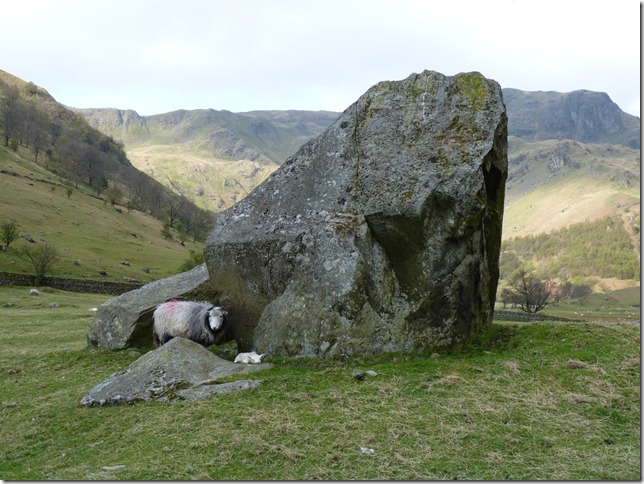 A mother protects its new born & glares as we pass, the spring lamb however is relaxing at the foot of a huge boulder left here by the previous ice field thousands of years ago |