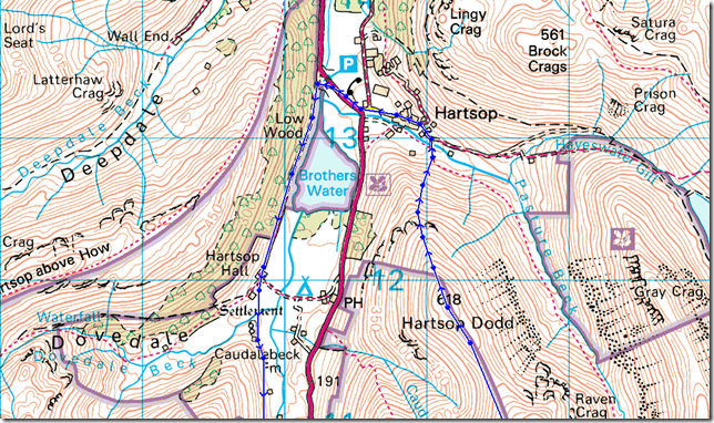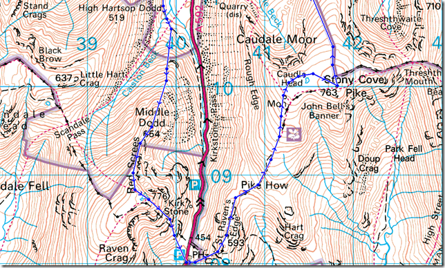 Cow Bridge – Brothers Water – Hartsop Hall – Middle Dodd – Smallthwaite Band – Red Screes – Kirkstone Pass – St Ravens Edge – John Bell’s Banner – Caudale Moor (Stony Cove Pike) – Hartsop Dodd – Hartsop – Cow Bridge |