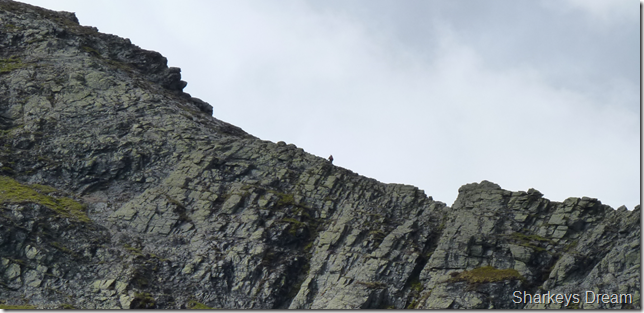 I have a good feel about the place as I take a few pictures around the tarn, here I spot three people on Sharp Edge focusing on this guy as he picks his way across the arête, the other two are on an ascent on Foule Crags just to the left & out of shot. |