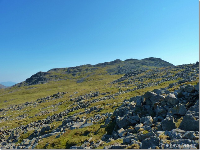 Lingmell summit comes into view as we traverse the boulder strewn plateau of Goat Crags. |
