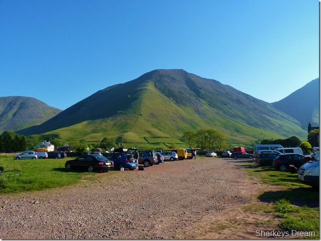 There is no sign of the crystal topped mountain skyline from the dead of winter – since my last visit to Wasdale & this here car park. This morning is positively glorious for an ascent on two of England’s highest peaks, well I say positively glorious, but it may be a tadge too warm, or at least it is going to be within the next few hours, this, a reason why we left Wigan at 5:30am this morning so at least we can break the back of Lingmell in the morning sunshine before its broke us.