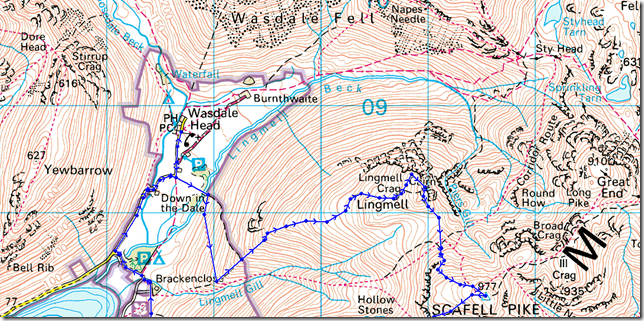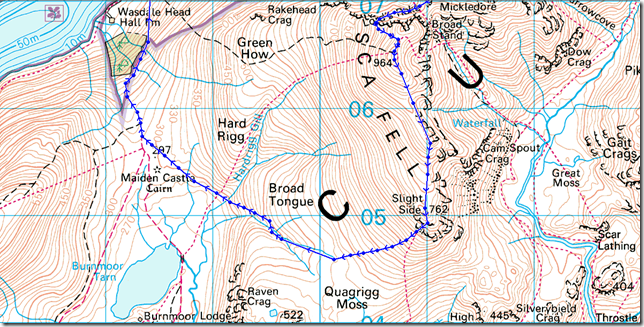 Wasdale Head – Down In The Dale – Brackenclose – Lingmell – Lingmell Col – Scafell Pike – Lords Rake – Scafell – Long Green – Slight Side – Quargrigg Moss – Great How – Burnmoor Tarn – Down In The Dale – Wasdale Head |