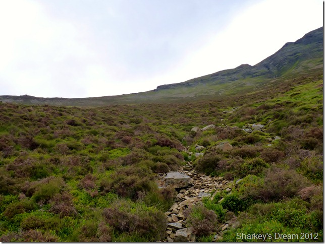 I was at the point where I needed to start thinking about heading up the fell side when I came across this narrow stone path, this was great news that there was a path & I needn’t have to scarper up through the wet heather, but to my disappointment this stone path is only visible for less than half the way I intended to use it, my aim is to get to around halfway you see in the photo or, at the top where the heather becomes less visible, then skirt across left to try & take in as much of the ridge as humanly possible.