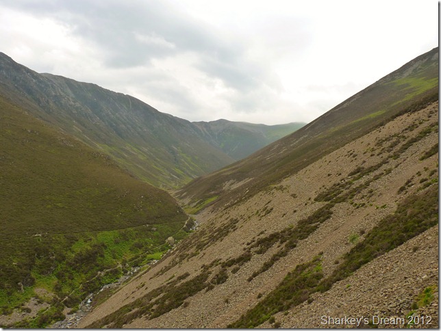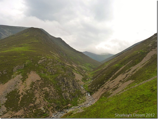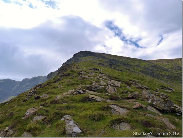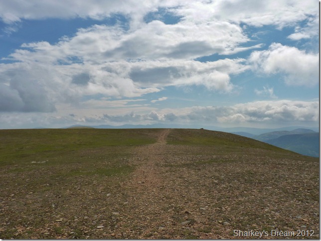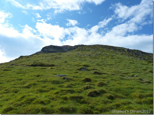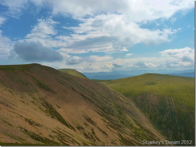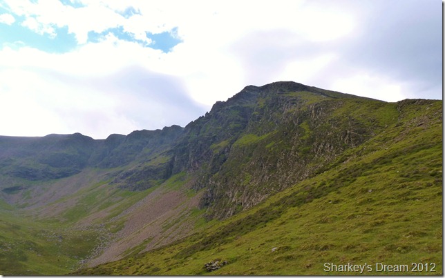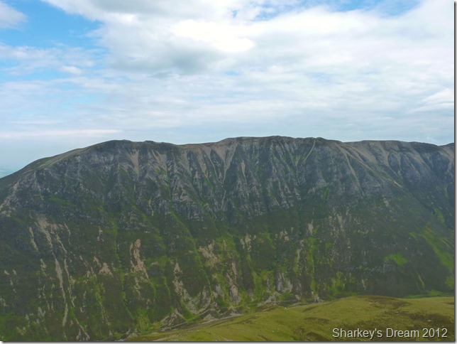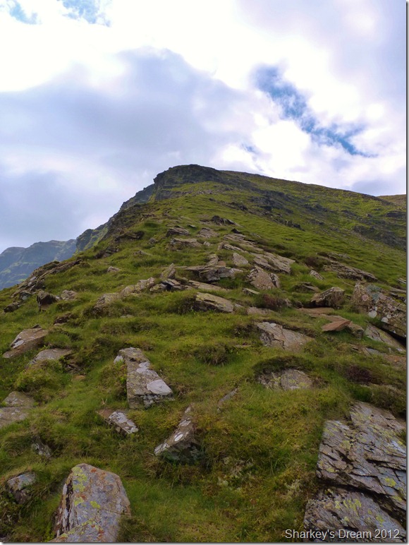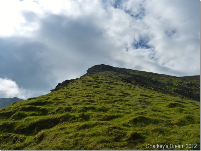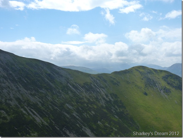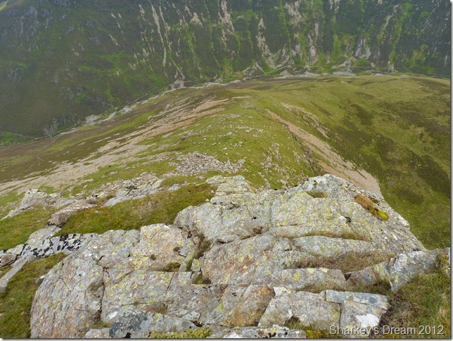 I soon learn that this is a fantastic way of the mountain either ascended or descended as I am today. Although the path is pretty steep it fashions the way down by steep zig-zags & before you know it you are on the fine grassy ridge you see in the foreground.