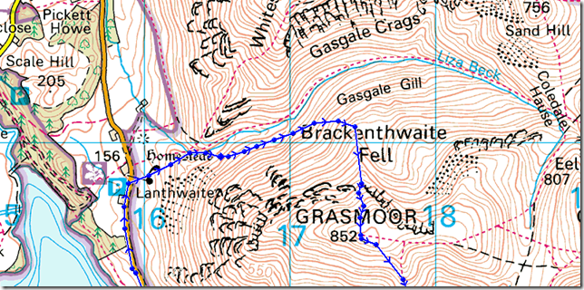 Lanthwaite Green – Gasgale Gill – Dove Crags Arête – Grasmoor – Lad Hows – Cinderdale Common – Hause Point – Lake Road – Lanthwaite Green |