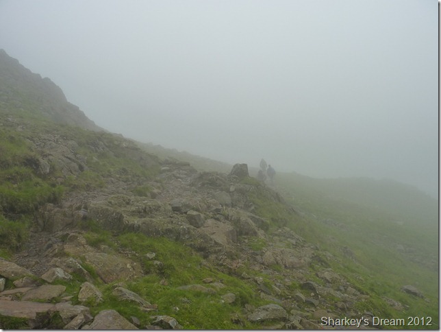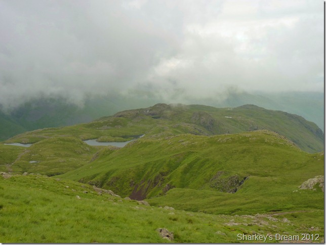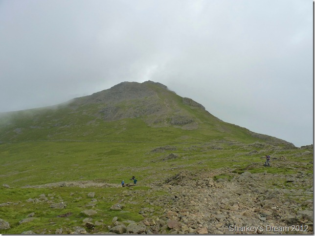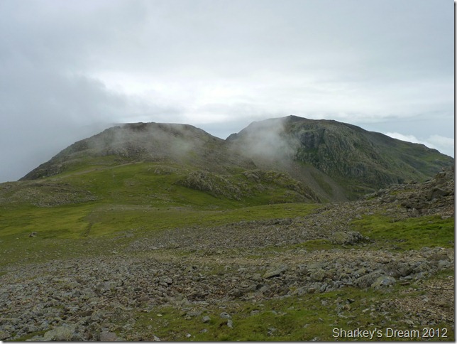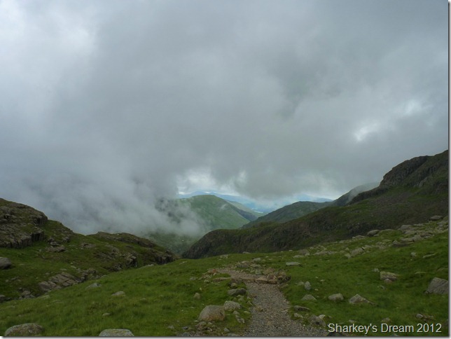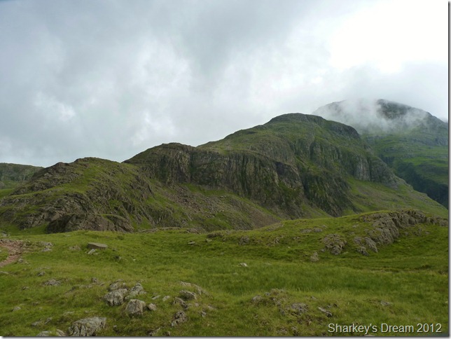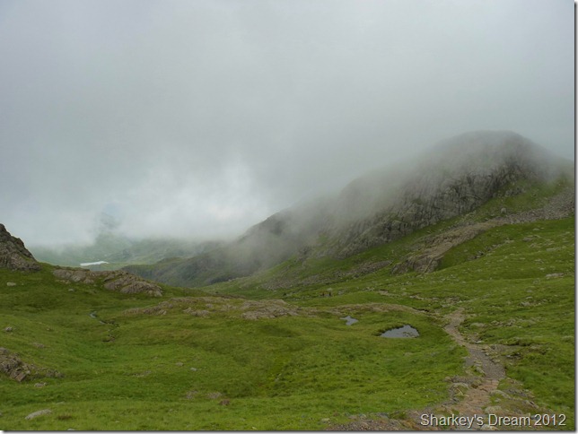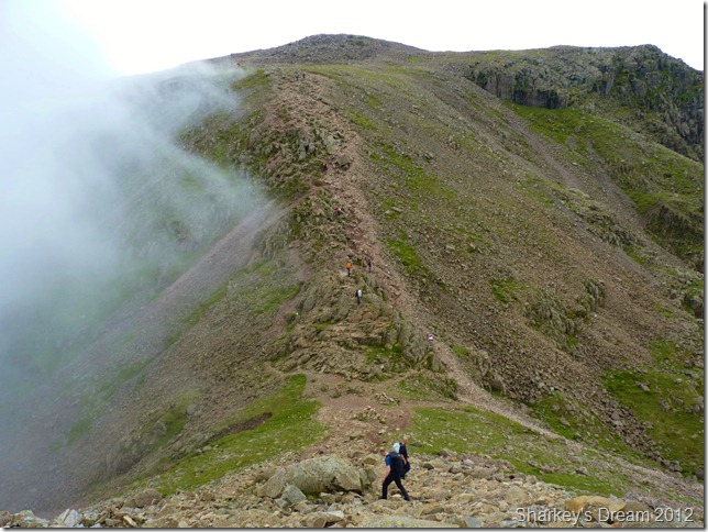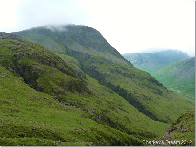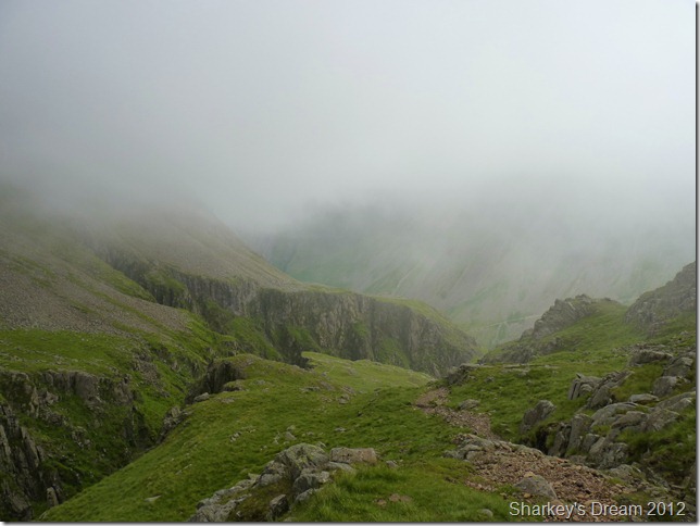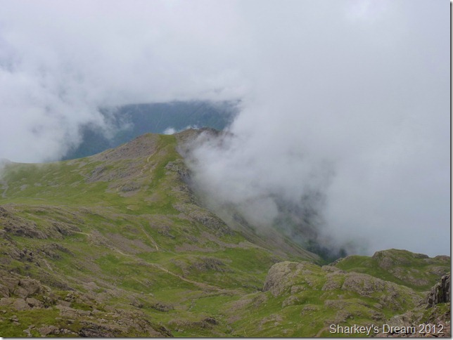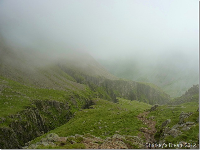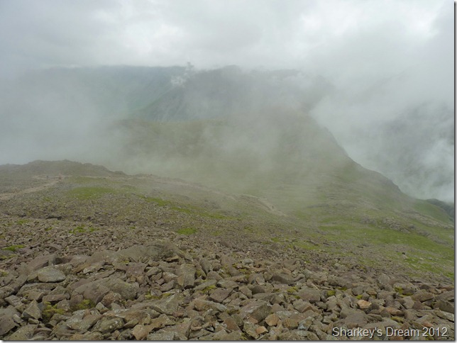 Heading down for Lingmell col while Lingmell & indeed Kirk Fell are just about visible through the cloud.