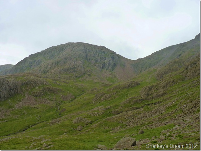 Great End dominates the walk up the valley, almost oppressively so by the time Ruddy Gill is forded to join the Langdale – Wasdale path, and from this point it is difficult to believe that the top of the great wall of rock towering directly in front can be reached by the simplest of walking; but this is so, and in fact the steepest climbing is already at an end at 2’000