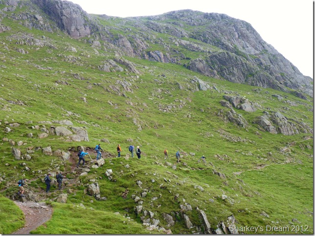 There is a slight dip in the path just to the right of the picture, it is here I meet a fellow much the same age as me, we comment on the weather & that how he had just got round this group of walkers descending the crag you see in the left hand of the picture.
