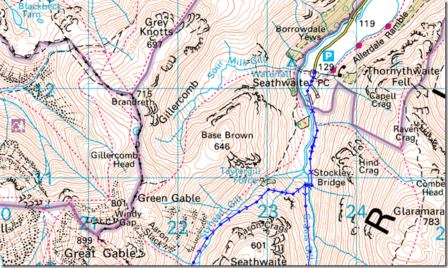 Seathwaite – Stockley Bridge – Grains Gill – Ruddy Gill – Esk Hause – Calf Cove – Great End – Ill Crag – Broad Crag – Broad Crag Col – Scafell Pike – Lingmell Col – Corridor Route – Skew Gill – Styhead Tarn – Stockley Bridge – Seathwaite |