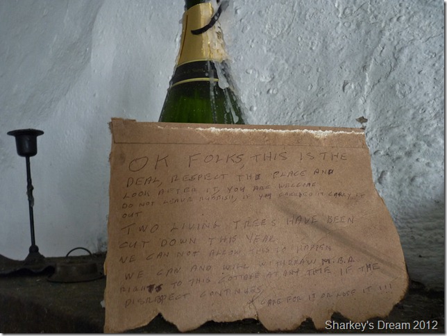 The note reads: Ok folks this is the deal, Respect the place and look after it, you are welcome. Do not leave rubbish, if you carried it in, carry it out.