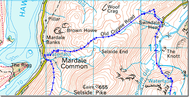 Haweswater Road – Hopgill Beck – Branstree North Ridge – Branstree – Selside Brow – Mosedale – Mosedale Cottage – Mosedale Beck – Swindale Head – The Old Corpse Road – Haweswater Road |