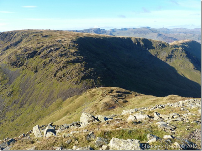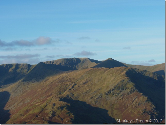 A close up (LtoR) of the huge mass that forms Birkhouse Moor, Striding Edge, Helvellyn, Swirral Edge & Catstycam. |
