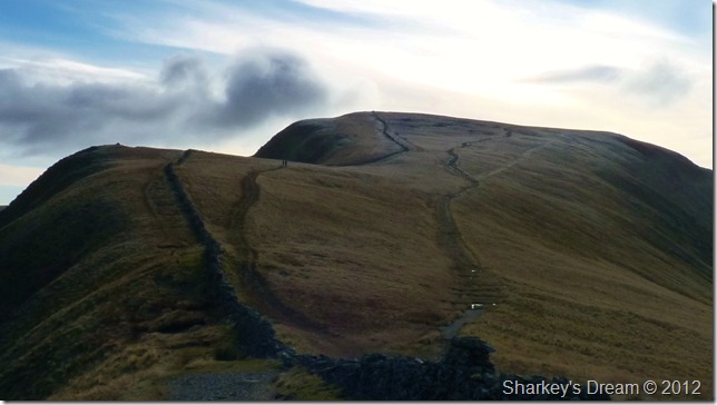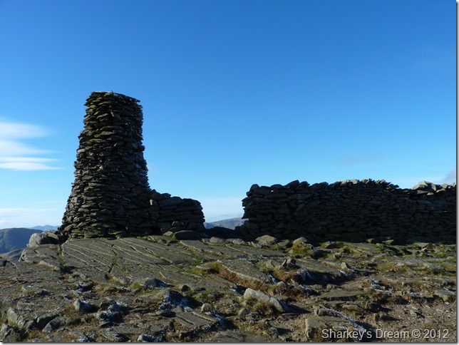 I had promised myself a short stay at the summit if not only to replenish spent energy with the bag of Maltesers I had been carrying all day. Stopping me from de-shouldering pack was the family of walkers cramped in behind the stone cairn, taking shelter from that biting wind – I sure was in envy of them.