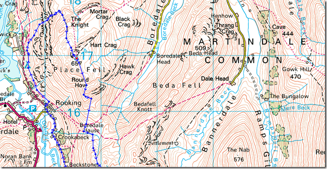 Hartsop – Dubhow – Beckstones – Crookabeck – Rooking – Side Farm – Place Fell – Round How – Steel Edge – Boredale Hause – Angletarn Pikes – Angle Tarn – Satura Crag – The Knott – Straights Of Riggindale – High Street – Thornthwaite Crag – Thresthwaite Mouth – Pasture Bottom – Pasture Beck - Hartsop |