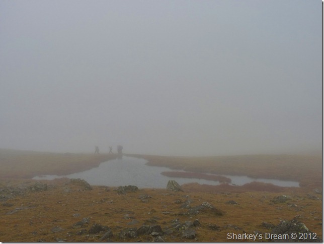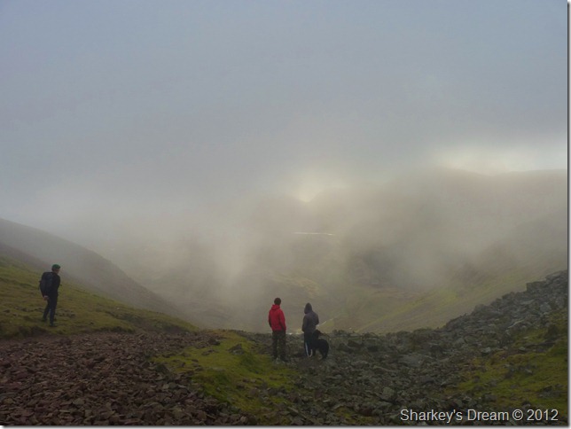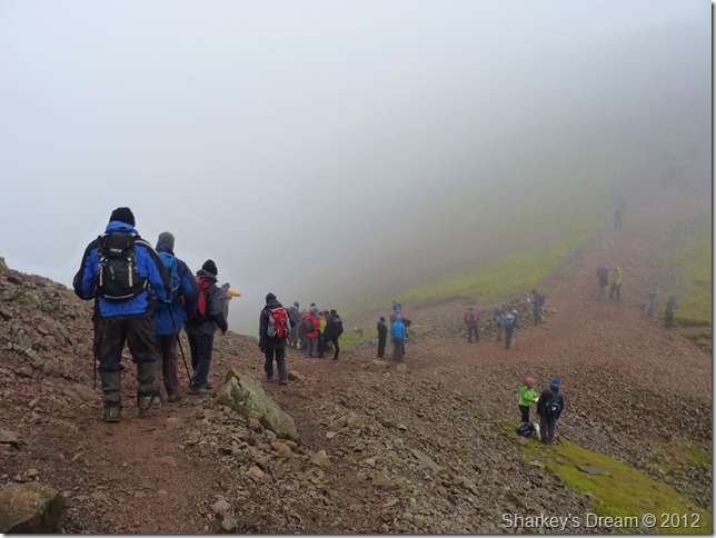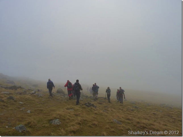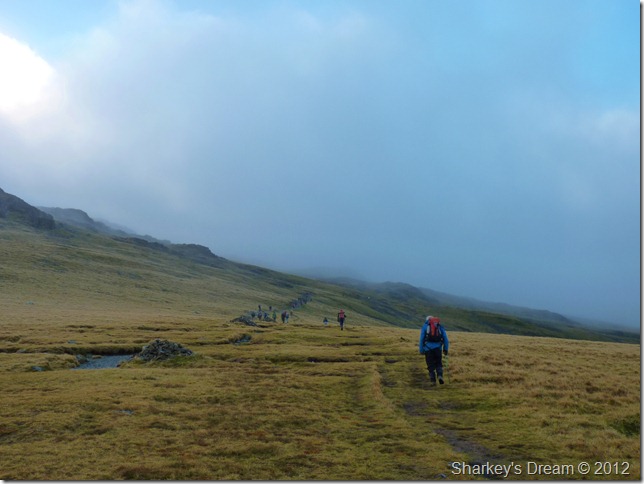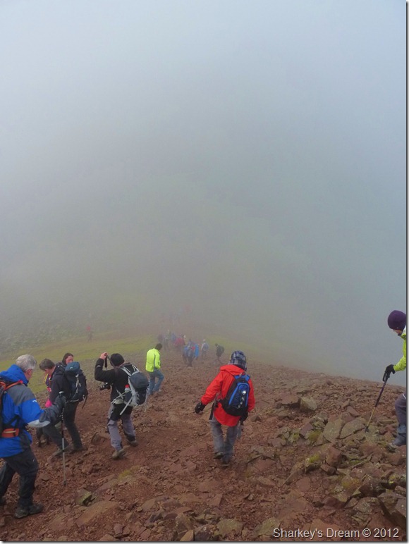 Looking north through the mist I soon spotted the path or at least a corner of it which then lead into an almost diagonal line, the corner I thought could be cut off via a short cut across fellside, a decision I was later to regret as this involved boulder hoping, walkers in front & now behind me choose to do the same as pairs of walkers soon fell into singular columns as they negotiated the wet rock & steep grass.