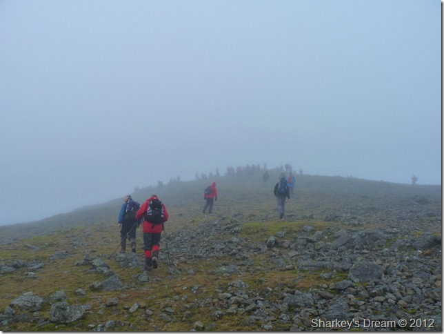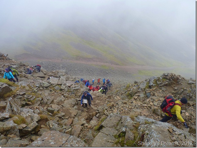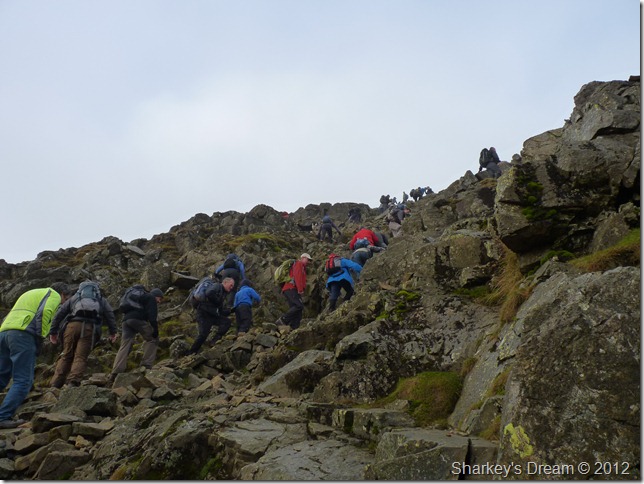 You could be forgiven for looking upon such a scene & muttering to oneself that what you see before you is nothing but organised chaos, yet you couldn’t be further from the truth, here walkers wait patently & offer a guiding, or indeed a helping hand so that everyone should reach the top safely. |