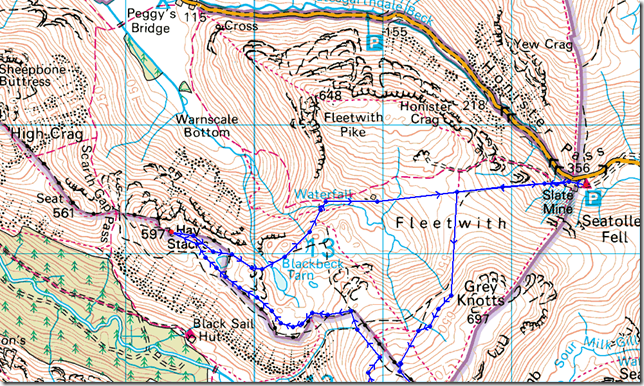 My path would more or less follow the fence you see on the right of the picture, or a narrow black broken line on the map, the path follows the fence line & after a little descent has been lost I picked up the path you see centre left along the backbone of Haystacks. |