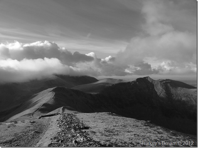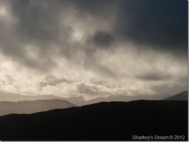 The distant Langdale fells appear in mono, as thick cloud momentarily obscure the sun. |