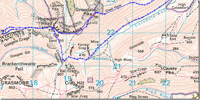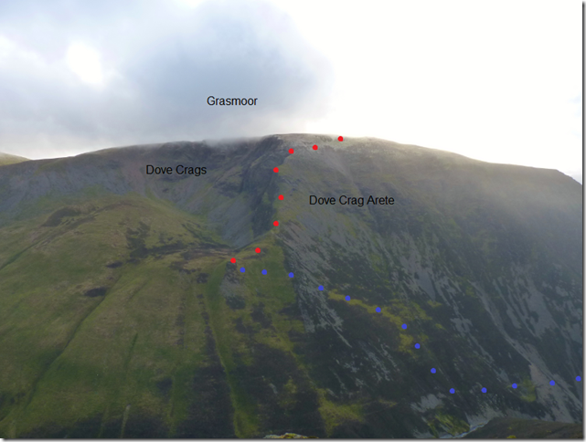 This scene set great memories from my traverse through Gasgale Gill & upon to Dove Crag Arête during this summer. In blue shows my approach path from the direction of Lanthwaite Green, in red my path to the summit via Dove Crag Arête & on towards Grasmoor’s summit plateau. |