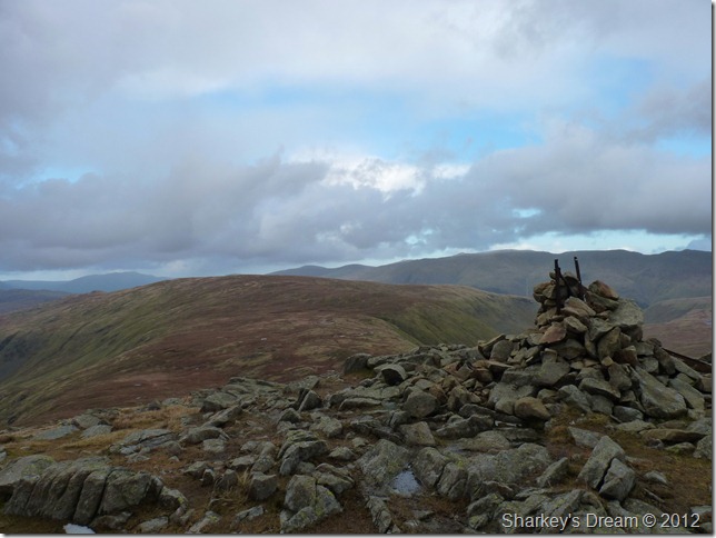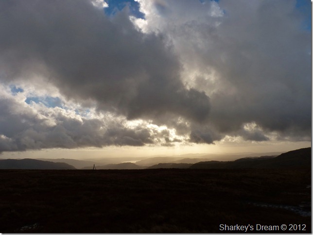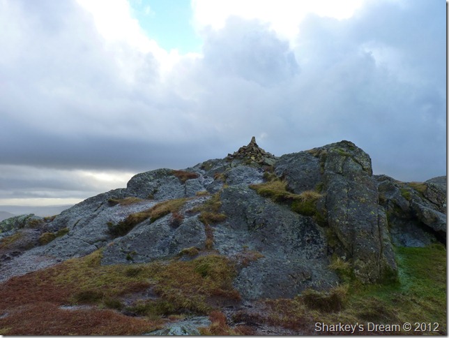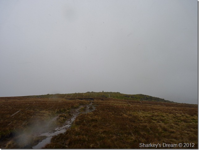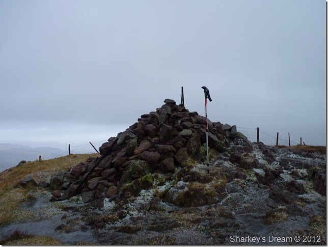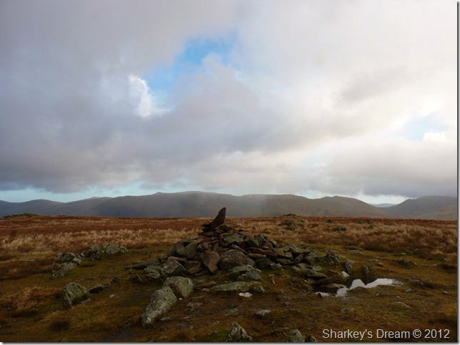 In between the last two photos I passed through a band of hail sweeping eastwards, I wouldn’t say it was cold as it was still rather mild if anything, it was here I donned the hood & walked with clenched fist until I reached the summit, here, off came the pack in search of a spare pair of gloves, not waterproof I might add as they were an old pair of Berghaus fleecy gloves I’ve had in the bottom of my pack for sometime now, I also carry a full-on pair of winter ski gloves but I think that’s a little too extreme just yet.