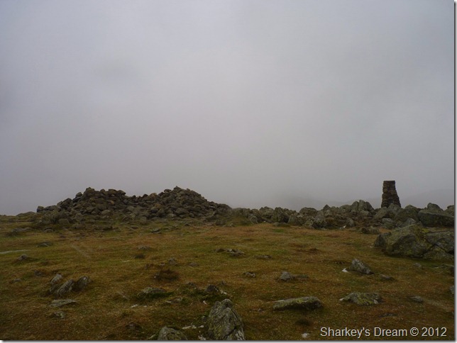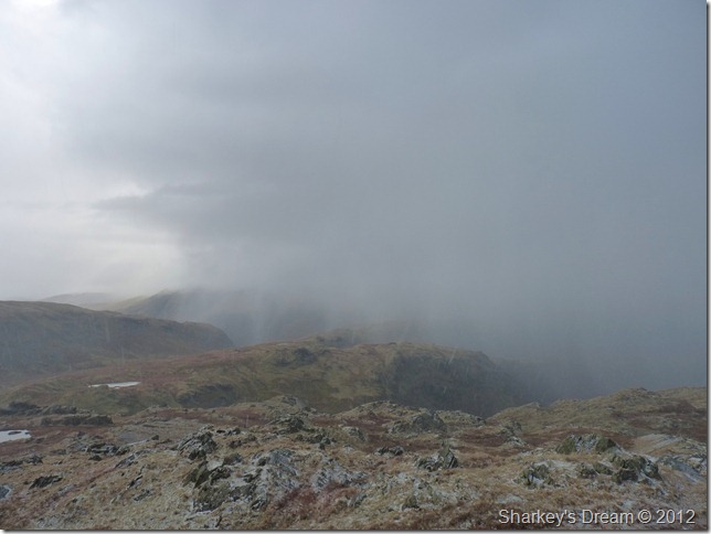 My tour of the Wythburn fells was almost complete as I take a brief shot of Steel Fell summit cairn within the mist of an approaching hail shower. |