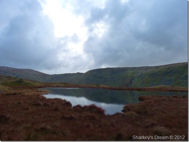 A narrow path leads you across the bog & mosses, sometimes this can be hard to navigate as the path runs through deep bogs & very wet ground underfoot, the tarn ahead is a good fix so with ten freezing toes I head off across the ridge & do a little bog trotting. |