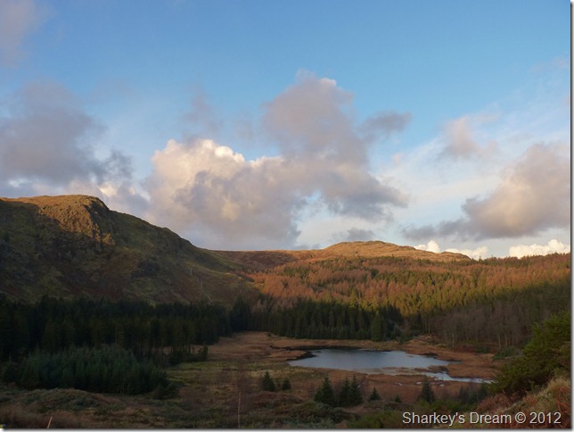 My path now takes me around the forestry track on the right of Harrop Tarn & up through the wooded area towards the col seen centre, but that is a little while away yet so I enjoy the beauty of Harrop Tarn whilst under morning shade. |