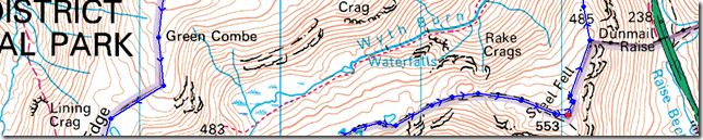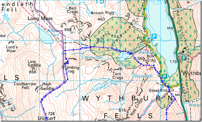 Wythburn – Birk Crag – Harrop Tarn – Mosshause Gill – Standing Crag – Ullscarth – Greenup Edge – Low White Stones – High Raise – Sergeant Man – Deep Slack – Brownrigg Moss – Steel Fell – Steel Fell North Ridge – Steel End – Wythburn |