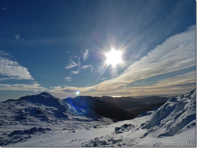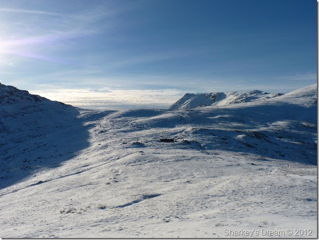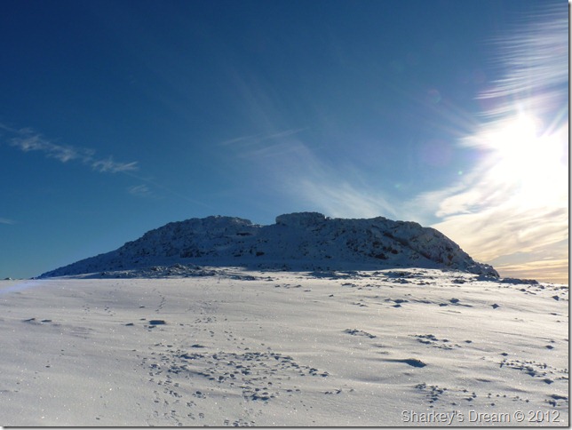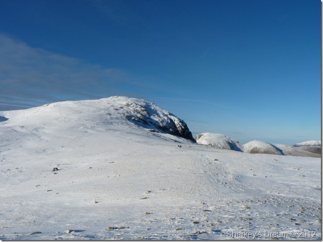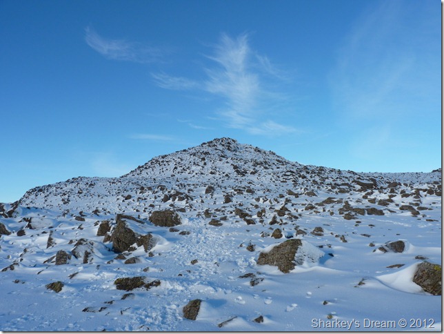 Of course I was going to go for it, in fact I made great time despite choosing the less obvious route to re-join with the summit path from the cross shelter resulting in tedious bog hopping over snow covered ground.