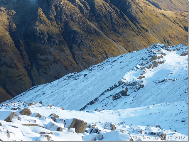 My path takes me left towards Three Tarns Col, the couple who had just overtaken me took the path towards the right which is The Climbers Traverse, I was a little sceptical & envious I might add that they were taken in the delights of The Climbers Traverse, all the while, along here I feel I made the right decision in not following them knowing that winter had taken full hold along the traverse.
